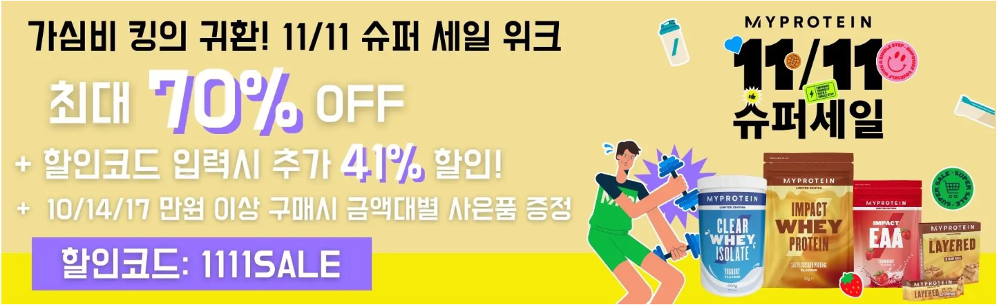 11월 11일(일)까지 진행됩니다. 이벤트 기간 동안 마이프로틴 공식 홈페이지에서 다양한 제품을 최대 80% 할인된 가격에 구매할 수 있습니다. 또한, 추가 할인코드, 사은품 증정 등 다양한 혜택도 제공됩니다.